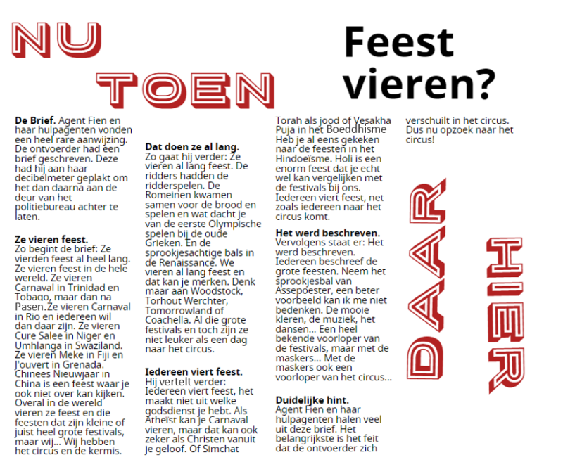 De dader weet heel veel van feesten. Om de dader beter te leren kennen, moeten wij ook meer weten. Hoe vieren ze feest over de wereld? En hoe deden ze dat vroeger? Hoe doen ze dat in de godsdiensten? En in verhalen, hoe vieren ze daar feest? Maar vooral, wat is feest?